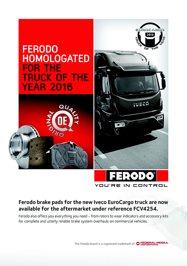 Federal-Mogul Motorparts, a division of Federal-Mogul Holdings Corporation is supplying brake pads for the 2016 International Truck Of The Year, the Iveco Eurocargo. The Ferodo brake pads provide exceptional braking performance, durability and enhanced NVH levels to Iveco’s new medium-duty truck. The components are available in the aftermarket through the Ferodo range, part number FCV4254