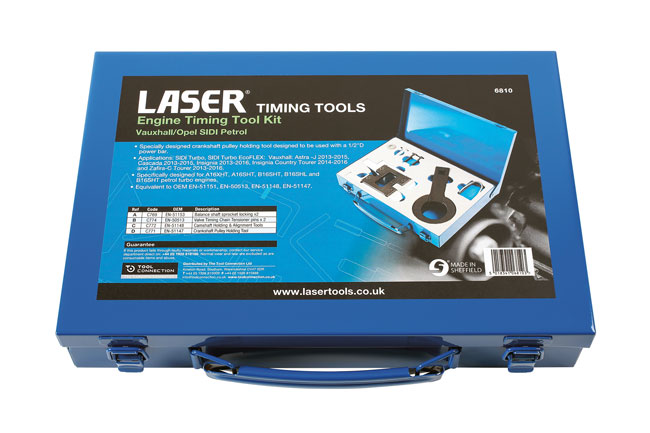 With Opel’s new family of SIDI (Spark Ignition Direct Injection) now firmly established across the range, Laser Tools has just released its comprehensive engine timing kit (part number 6810) for the 1.6 litre version. Designed and manufactured by Laser Tools in Sheffield, the kit provides the essential tools required when replacing the camshaft drive