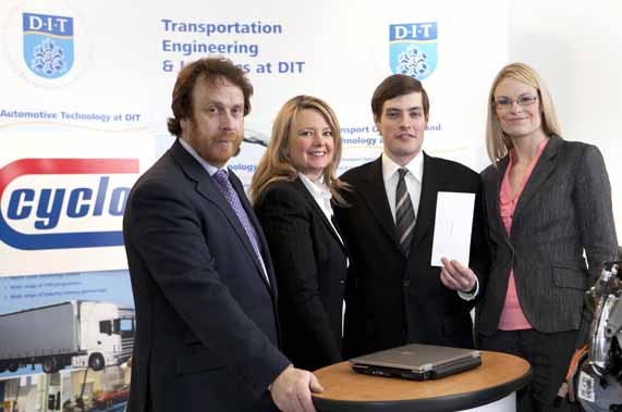 In a further demonstration of the company’s commitment to student education, Cyclo Industries Inc. recently presented DIT student Kalman Strohmayer with a grant of €500 in recognition of his 2011 award for best final year project in the DIT Department of Transport Engineering, BEngTech in Automotive Management and Technology degree programme.