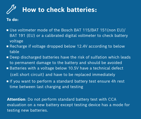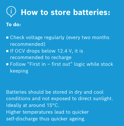 Below are a few tips from Bosch on how to store, check and recharge batteries: