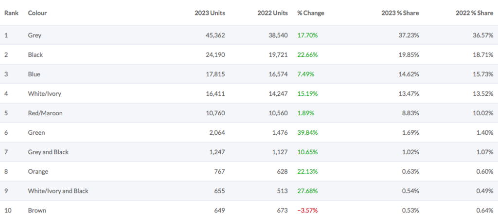 In Ireland, the second most popular shade in 2023 was once again black, with 24,190 units sold. Black had a 19.85 per cent share of the market here.