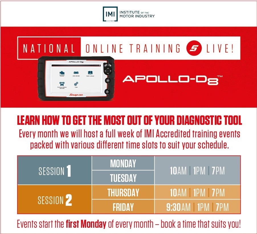 Snap-on Tools is hosting a series of online training sessions which it says will help technicians get up to speed with their new Apollo-D8 diagnostic scan tools powered by intelligent diagnostics.